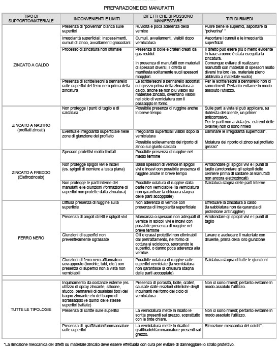 B.1.3 Preparazione del manufatto. Il materiale grezzo da verniciare deve essere preparato e fornito a regola d’arte per ottenere la conformità del prodotto finito. La tabella che segue evidenzia varie tipologie di inconvenienti possibili dipendenti dallo stato e dal tipo di superfici e indica, corrispondentemente, possibili rimedi per limitare alcuni degli effetti negativi.