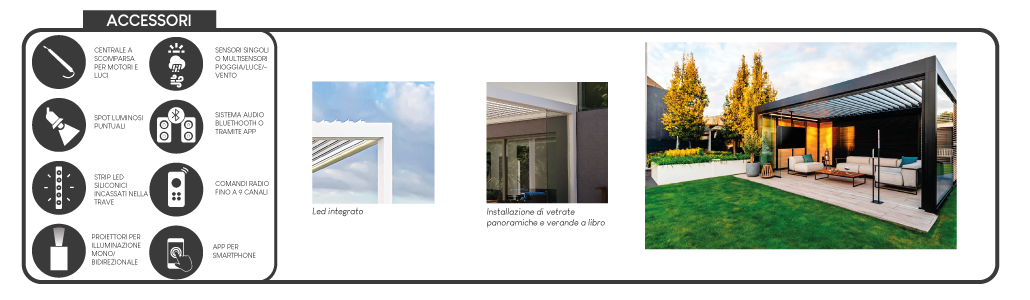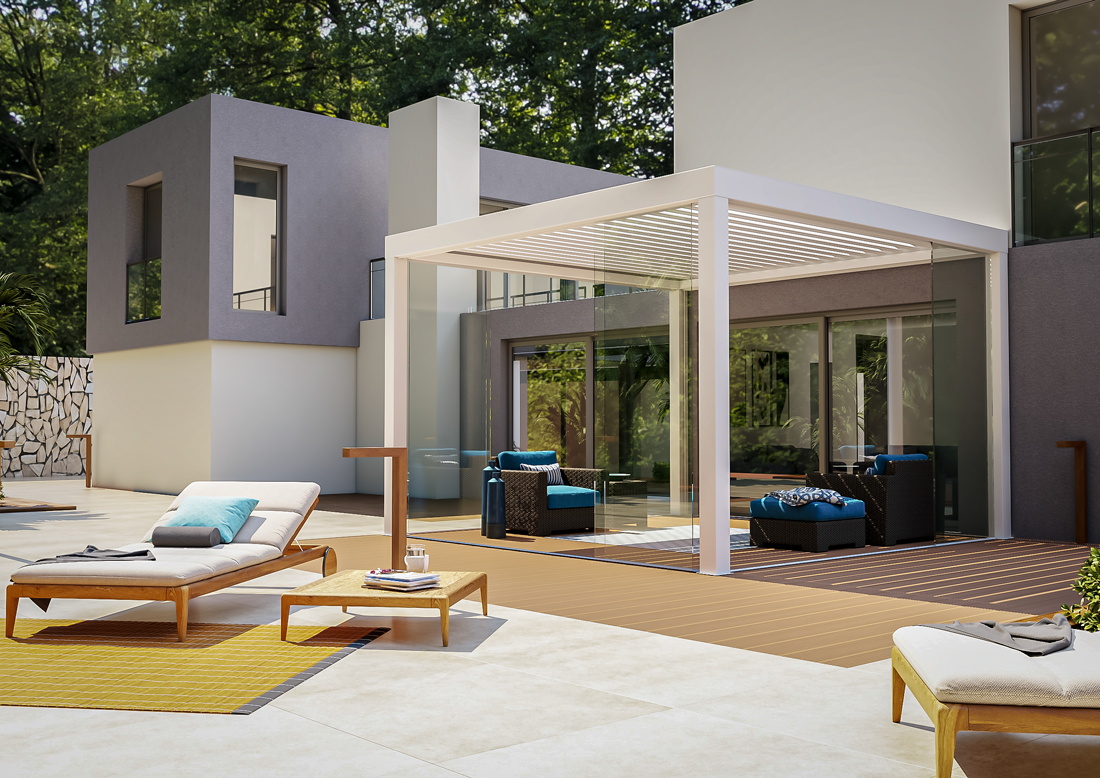 La pergola bioclimatica Convivium di Colma completa la vasta gamma prodotti per giardini di inverno, una soluzione innovativa per creare un ambiente confortevole e versatile all’aperto. Con un design elegante e funzionale, la pergola Convivium si adatta perfettamente a qualsiasi stile di arredamento esterno, valorizzando giardini, terrazze e attici. Essa rappresenta la soluzione ideale per creare spazi esterni vivibili, sicuri e facili da realizzare in quanto non richiedono permessi edilizi. La Pergola è realizzata con staffe in acciaio ed alluminio estruso con tagli a 90° rifinita con carter in alluminio estruso personalizzabile con logo.